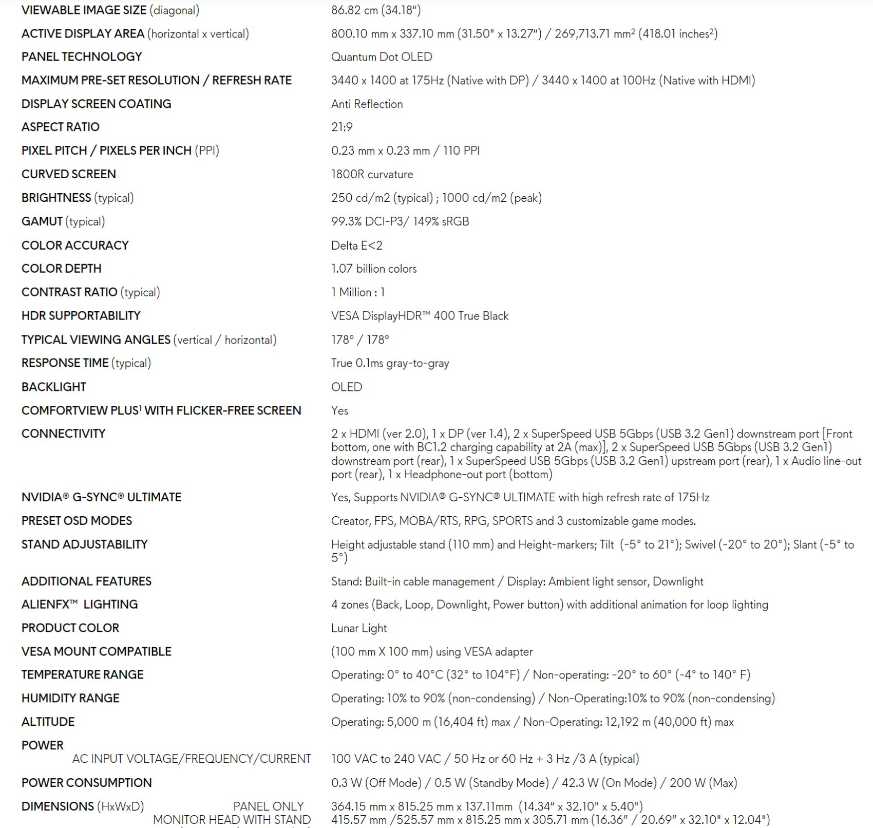 The Alienware 34 Curved QD-LED Gaming Monitor offers a resolution of 3440×1440, which gives it an aspect ratio of 21:9. It’s said to feature Nvidia’s G-Sync Ultimate, with refresh rates of up to 175 Hz over DP and 100 Hz over HDMI. It has a typical brightness of only 250 cd/m², but as this is an HDR capable display, this can go as high as 1000 cd/m² in HDR mode. The monitor sports one DisplayPort 1.4, two HDMI 2.0 ports and three USB 3.2 ports at 5 Gbps, as well as a 3.5 mm headphone jack and a line-out jack. No word on pricing as yet, but it would be silly to presume this will be a cheap monitor.