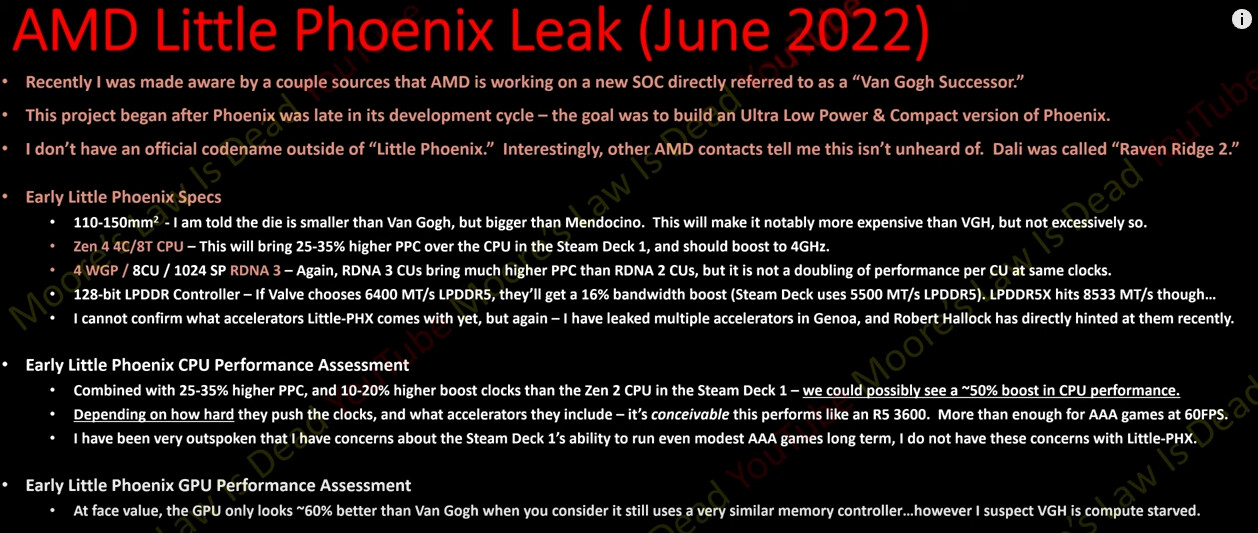 AMD is allegedly preparing an upgraded quad-core APU with Zen 4 and RDNA3 architectures for a next-generation Steam Deck device according to Moore’s Law is Dead. The report claims that the chip is referred to as a “Van Gogh Successor” internally with a die size between 110 mm² and 150 mm² resulting in an increased production cost. The chip should feature 4 Zen 4 cores and 8 threads offering 25% – 35% higher performance per clock (PPC) with a maximum boost of 4 GHz. The RDNA3 graphics will include 8 Compute Units with significantly higher PPC compared to their RDNA2 counterparts which combined with the updated CPU could see a performance improvement up to 50%. These rumors have not been confirmed with any potential Steam Deck processor far from being announced or released anytime soon.