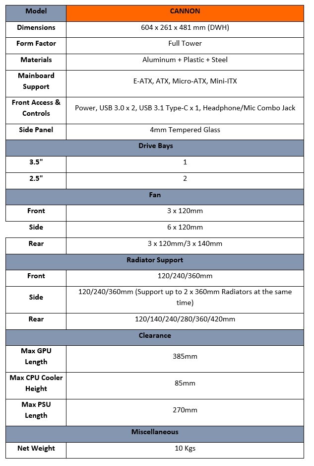 The Cannon features well-processed panel edges and snap-inside panels, all aluminium alloy made and CNC-cut craftsmanship. It supports up to 3 x 360 mm radiators simultaneously. For advanced PC-DIY users, the maximum is four radiators: