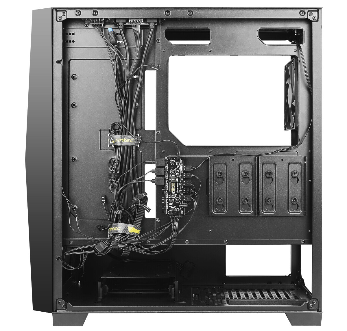 The I / O panel features Power and reset buttons, two USB 3.0 and Mic/Audio jacks. Included dust plugs cater for damage prevention. With 34,5 mm in the front and 26,5 mm clearance in the rear, the case offers sufficient space for cable management, allowing for a clean build and optimized air flow.