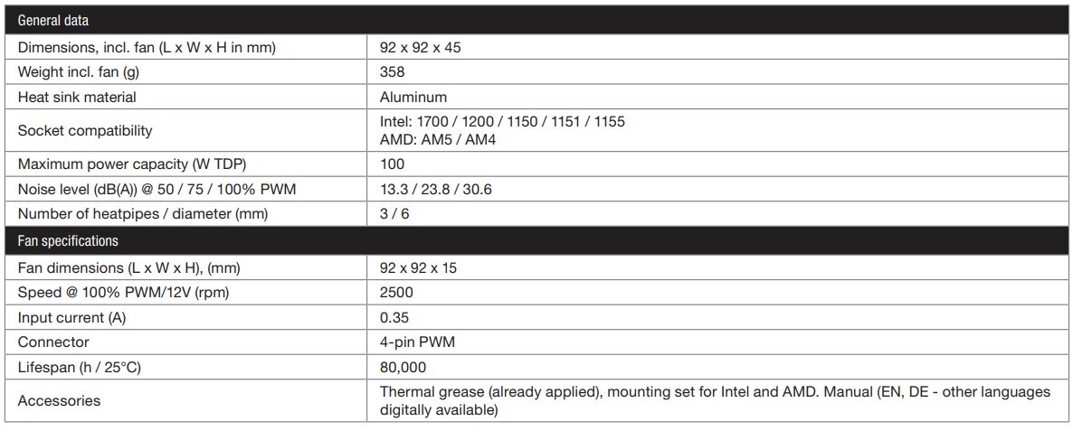 Due to its remarkably low height of 45 mm, Pure Rock LP will fit into the tightest of systems, such as Mini-ITX HTPCs and small multimedia or gaming systems. Its compact design enables full configurations of RAM banks even in PC cases with limited space. Despite its small size, Pure Rock LP delivers high enough cooling power of 100 W TDP thanks to three high-performance 6 mm heat pipes and a 92 mm quality fan. The fan has an ultra-low height of 15 mm and supports a silent operation of 30,6 dB(A) with a maximum speed of 2500 rpm. With its brushed aluminium finish and mounting options for AMD and Intel, the black Pure Rock LP will look good in any compact build. The cooler comes with a full 3-year manufacturer’s warranty.
