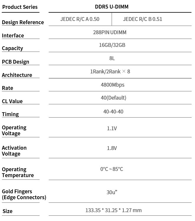 DDR4 DIMM enables a data transfer rate of up to 3200 Mbps at 1.6 GHz. In comparison, DDR5U-DIMM offers a bandwidth of up to 4800 Mbps, providing an increase of 50%. The product allows a minimum supply voltage of 1.1 V, outperforming that of DDR4 (1.2 V) and reducing power consumption.