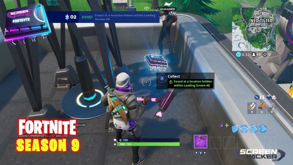 Fortbyte 2 Found At A Location Hidden Within Loading Screen can be found in Neo Tilted, on the tall building with a tower and has the spinning hologram numbers. You’ll find this FortByte at the base of the tower.