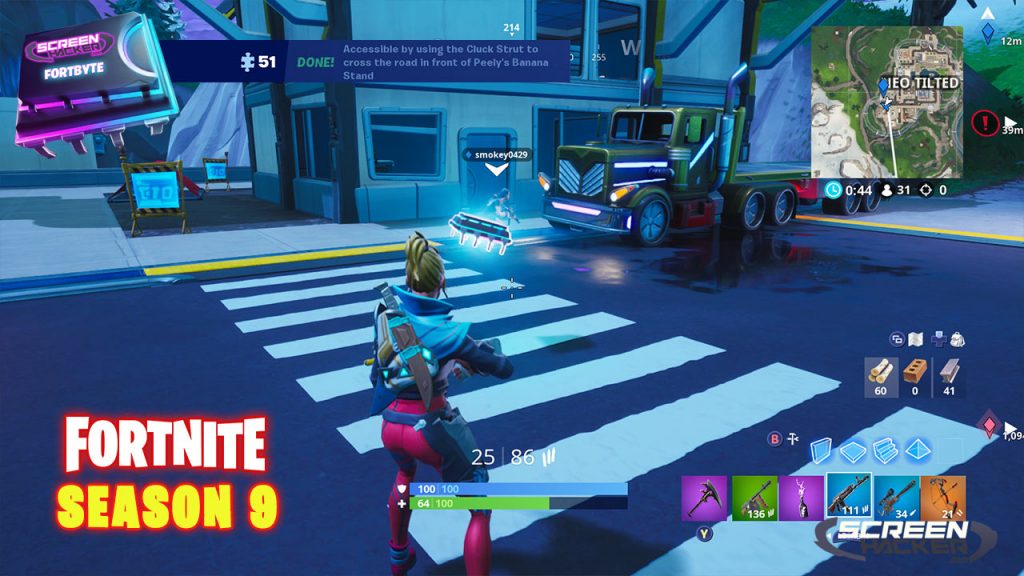 Fortbyte 51 is found in the south side of Neo Tilted, there is a street crosswalk where you have to “dance” your way accross by using the “Cluck Strut” emote. The location is listed as in front of Peely’s Banana Stand.