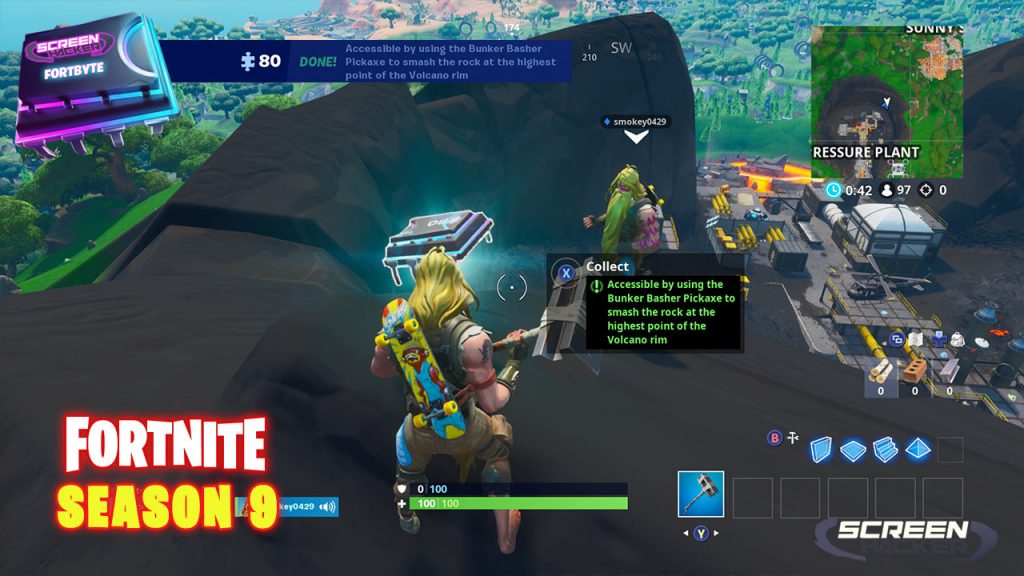 Fortbyte 80 is Accessible By Using The Bunker Basher Pickaxe To Smash The Rock At The Highest Point Of The Volcano’s rim, once you break the rock, the FortByte will appear.