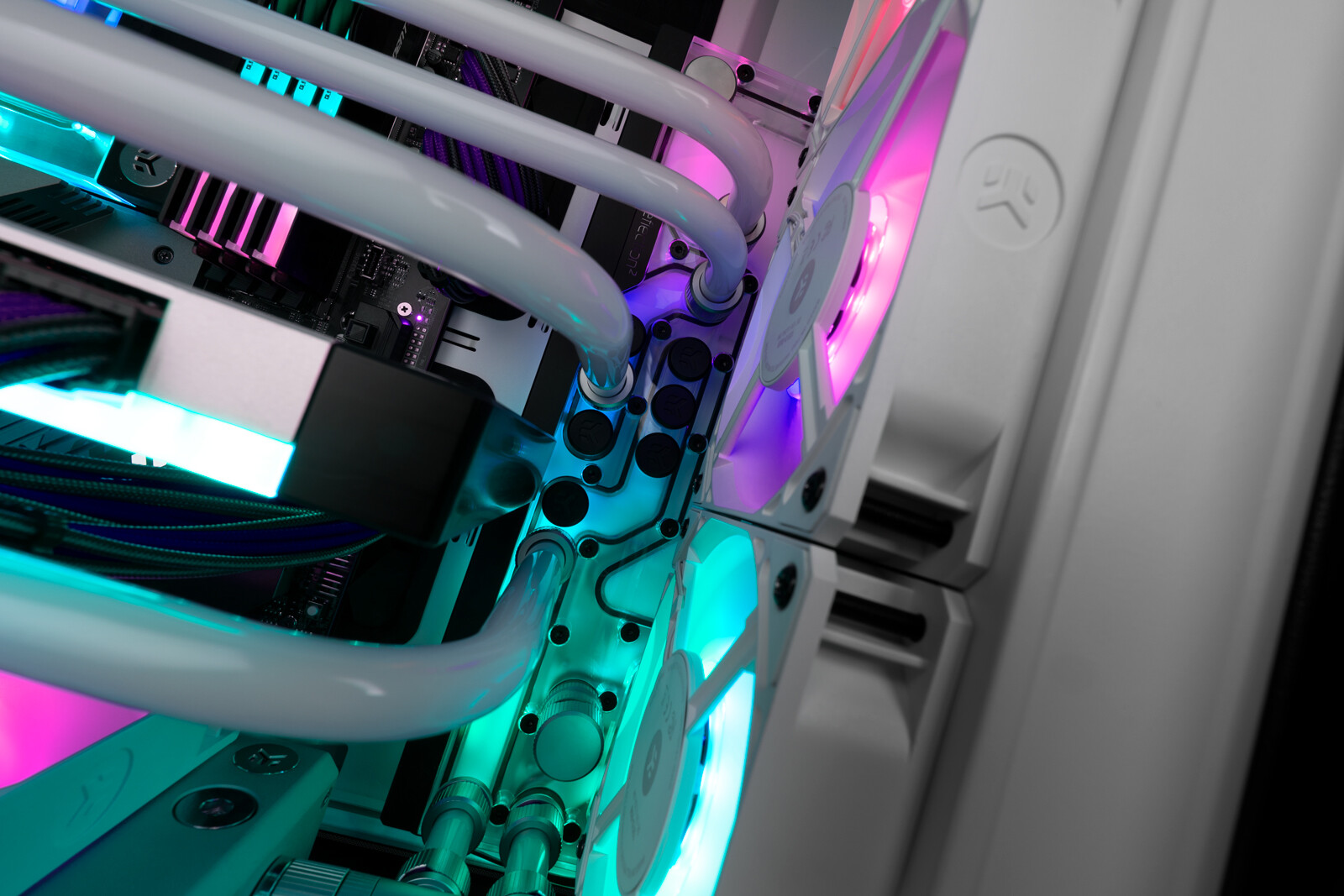 The EK-Quantum Reflection² Torrent DDC 4.2 PWM D-RGB – Plexi offers an all-in-one solution that includes a DDC 4.2 pump, reservoir, simple mounting mechanism, and multiple industry-standard G1/4″ threaded inlets and outlets. The placement of these inlets and outlets is perfectly aligned to match other components that are typically water-cooled, allowing minimum effort when routing the tubes. The distro plate can support up to one CPU water block, GPU block, and two radiators.