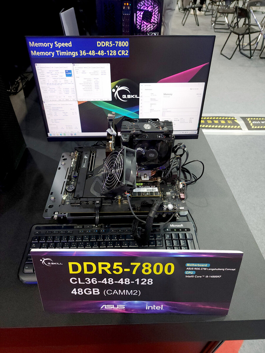 With the introduction of the new CAMM2 module standard, G.SKILL is also tapping into the overclock performance of this new form-factor. To display the overclocking ability of this new memory module type, G.SKILL shows off a CAMM2 module running at an astounding DDR5-7800 CL36 high-speed, low-latency 48 GB memory module on an Intel Core i9-14900KF processor and ASUS ROG Z790 Lengshuikeng Concept motherboard.