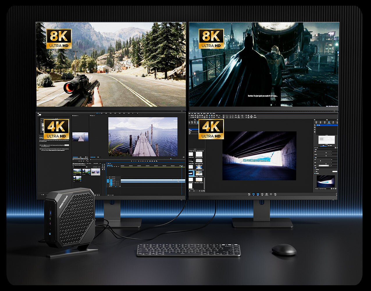 HX99G supports quad display: two 4K/60 Hz displays through HDMI 2.0 and two 8K/60 Hz displays through USB 4. Other ports include: