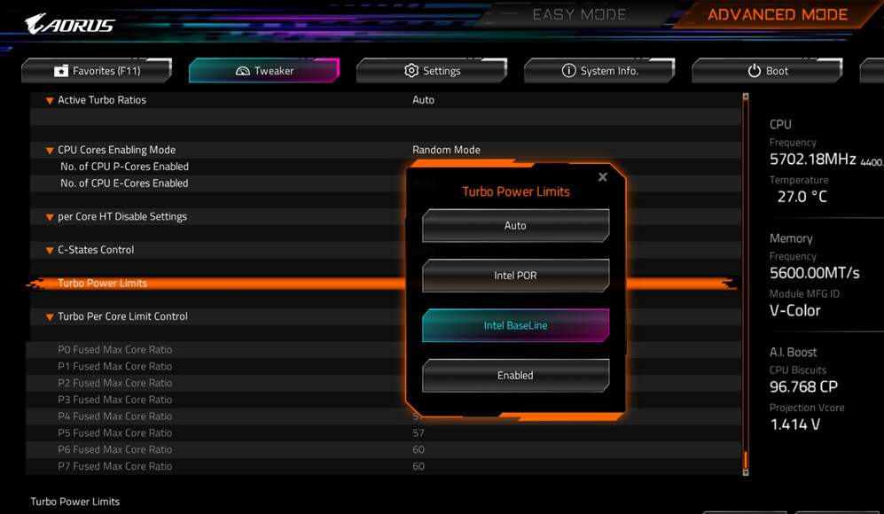 GIGABYTE always prioritizes user experience, focusing on both performance and stability. Additionally, as a close ally of Intel, we promptly introduced the Intel Baseline feature with the latest beta BIOS. When using 13th and 14th generation K-SKU CPUs, the Intel Baseline setting will appear in the “Turbo Power Limits” option under “Advanced CPU Settings”. After enabling Intel Baseline, the performance will be expected to be limited due to the power setting adjustments.